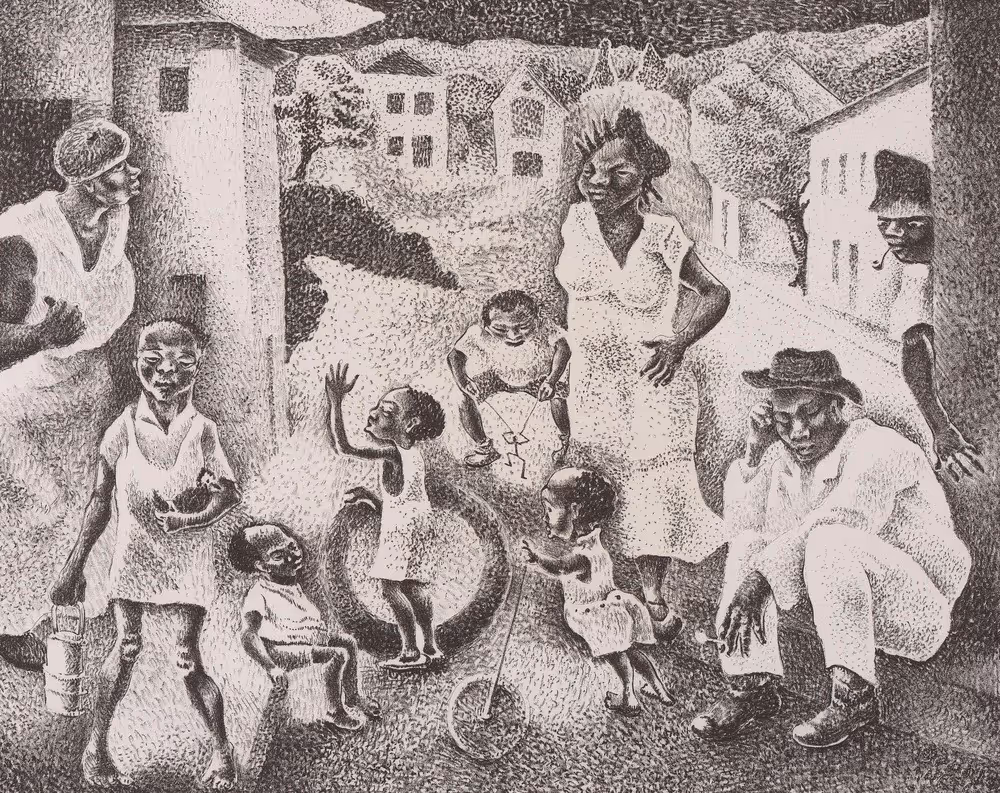 Biddle made this lithograph, Catfish Row, which is the setting for Heyward’s book and Gershwin’s opera. It was not one of the illustrations included in the libretto. It was inspired by a place known as “Cabbage Row” in Charleston, where, historically, Black residents sold cabbages and other crops. Gershwin also prepared a musical suite, “Catfish Row,” originally titled “Suite from Porgy and Bess,” which premiered at the Academy of Music in Philadelphia on January 21, 1936. We may wonder if Biddle’s Catfish Row lithograph was somehow connected to the musical suite by his friends, the Gershwins.