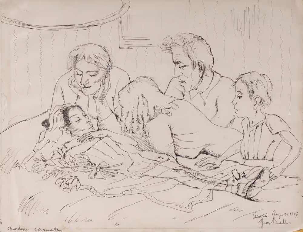In 1943, Biddle was appointed chairman of the US War Department’s Art Advisory Committee. He was responsible for selecting nearly eighty artists to travel with Army troops on battlefields across the globe to document the experience of World War II in works of art. Biddle himself became a war correspondent and spent six months in Tunisia and Italy with American servicemen. His drawings include portraits of military leaders and rank-and-file soldiers, landscapes of rolling Italian hills that had become theaters of war, and the suffering of civilians.