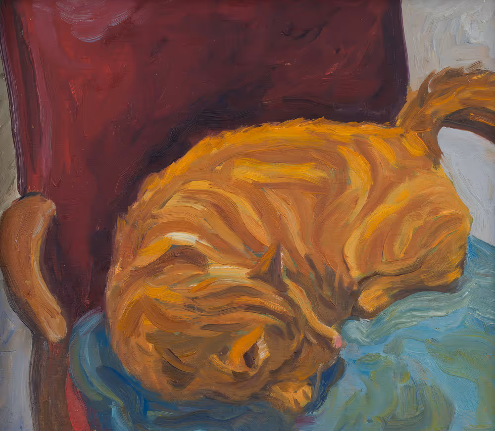 A Philadelphia-born artist, Kohler discovered his love of art in the city’s museums before earning a BFA from the Maryland Institute College of Art and an MFA from the School of the Art Institute of Chicago. His paintings range from portraits and landscapes to purely abstract compositions. Here, however, the subject is unmistakable: a sleepy orange cat curled on a green cushion atop a red armchair. Fiery golden stripes trace the animal’s contours, emphasizing both its languid posture and latent vitality. Capturing cats has long challenged artists—critic Carl Van Vechten once observed that “the beauty of the cat is very deceptive, for under the grace of the furry exterior lie steel-like muscles, [and its] face bears a character of both finesse and hilarity.” Few portraitists, he lamented, “can go beyond externals.” Kohler’s rendering rises to this challenge.