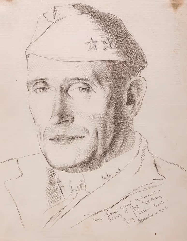 In 1943, Biddle was appointed chairman of the US War Department’s Art Advisory Committee. He was responsible for selecting nearly eighty artists to travel with Army troops on battlefields across the globe to document the experience of World War II in works of art. Biddle himself became a war correspondent and spent six months in Tunisia and Italy with American servicemen. His drawings include portraits of military leaders and rank-and-file soldiers, landscapes of rolling Italian hills that had become theaters of war, and the suffering of civilians.