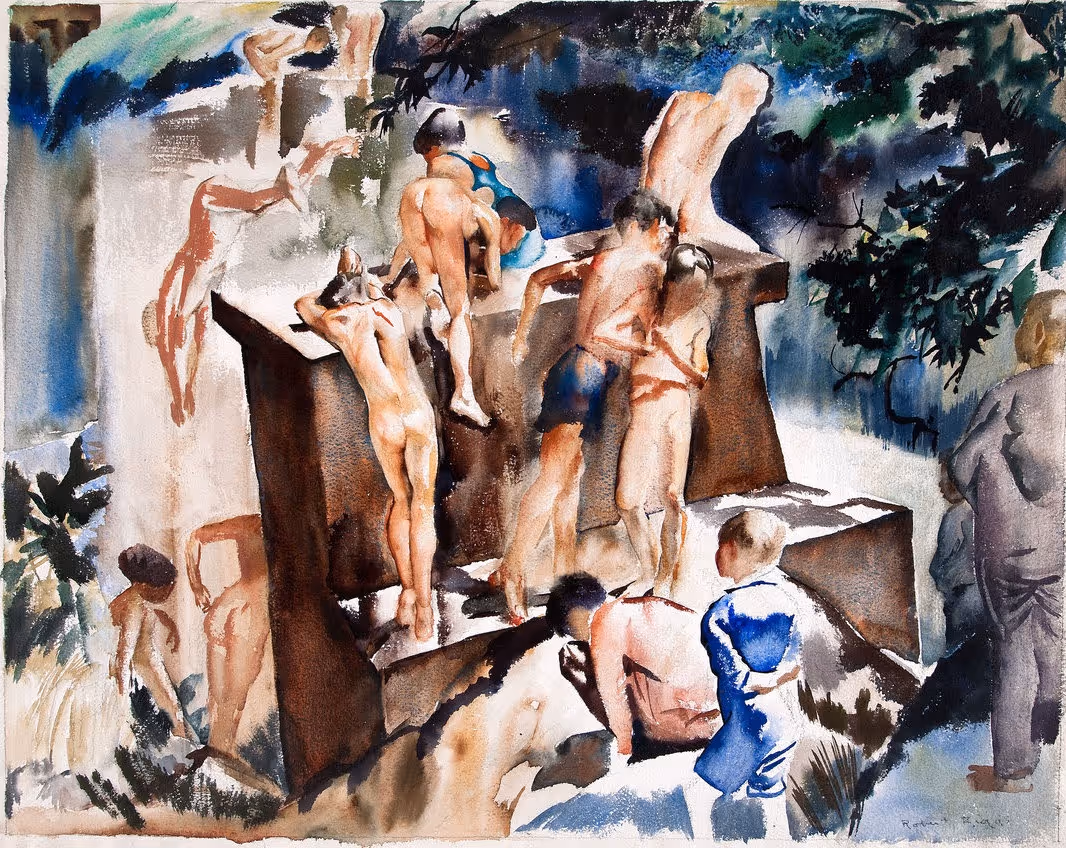 Robert Riggs often returned to the subject of nude male swimmers, whether outside or at the Germantown Boys’ Club (see, for example, Nude Swimmers by Arched Stone Bridge). In this watercolor, youths in various of stages of undress climb up a stepped structure and plunge into the water.