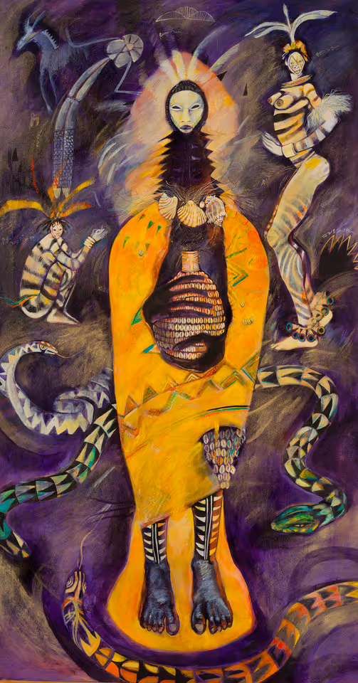 Characteristic of Bullock’s paintings from this period, Remembrance features a powerful female figure undergoing transformation. Moved to a trance-like state by the dancers flanking her, she clutches a sacred vessel adorned with cowrie shells. Her yellow, stylized form echoes the vessel’s shape, as if the energy flows into and transforms her body. She becomes a keeper of histories. Three serpents undulate around the figure, their ability to shed skin representing constant cycles of change and renewal.