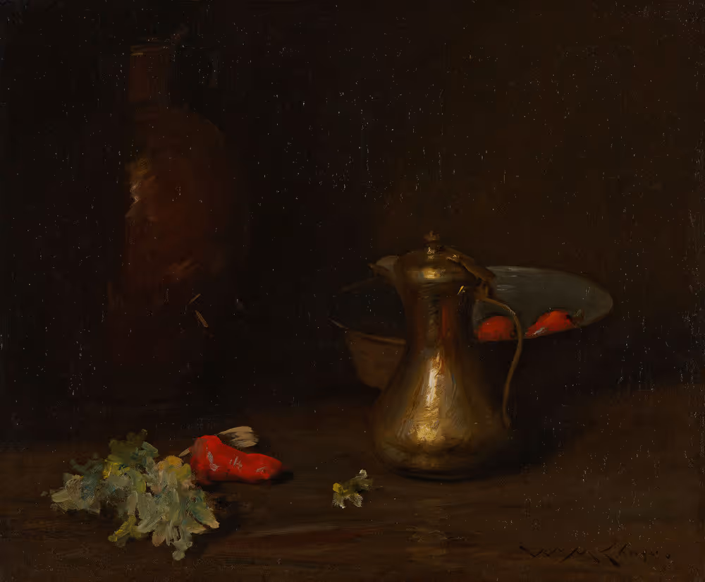 Still lifes were such a staple of Chase’s artistic production that he worried he would be remembered as “a painter of fish.” Through his intense study of Impressionist Édouard Manet’s work in the 1890s, Chase discovered still lifes by Spanish Baroque artists such as Diego Velázquez. The result was a period of dark and earthy compositions with objects from ordinary kitchens. Here, an assortment of vessels stands on a table in a dark interior. A brass coffee pot reflects a warm, narrow light and scattered vegetables serve as colorful counterpoints, drawing attention to the artist’s expert brushwork.