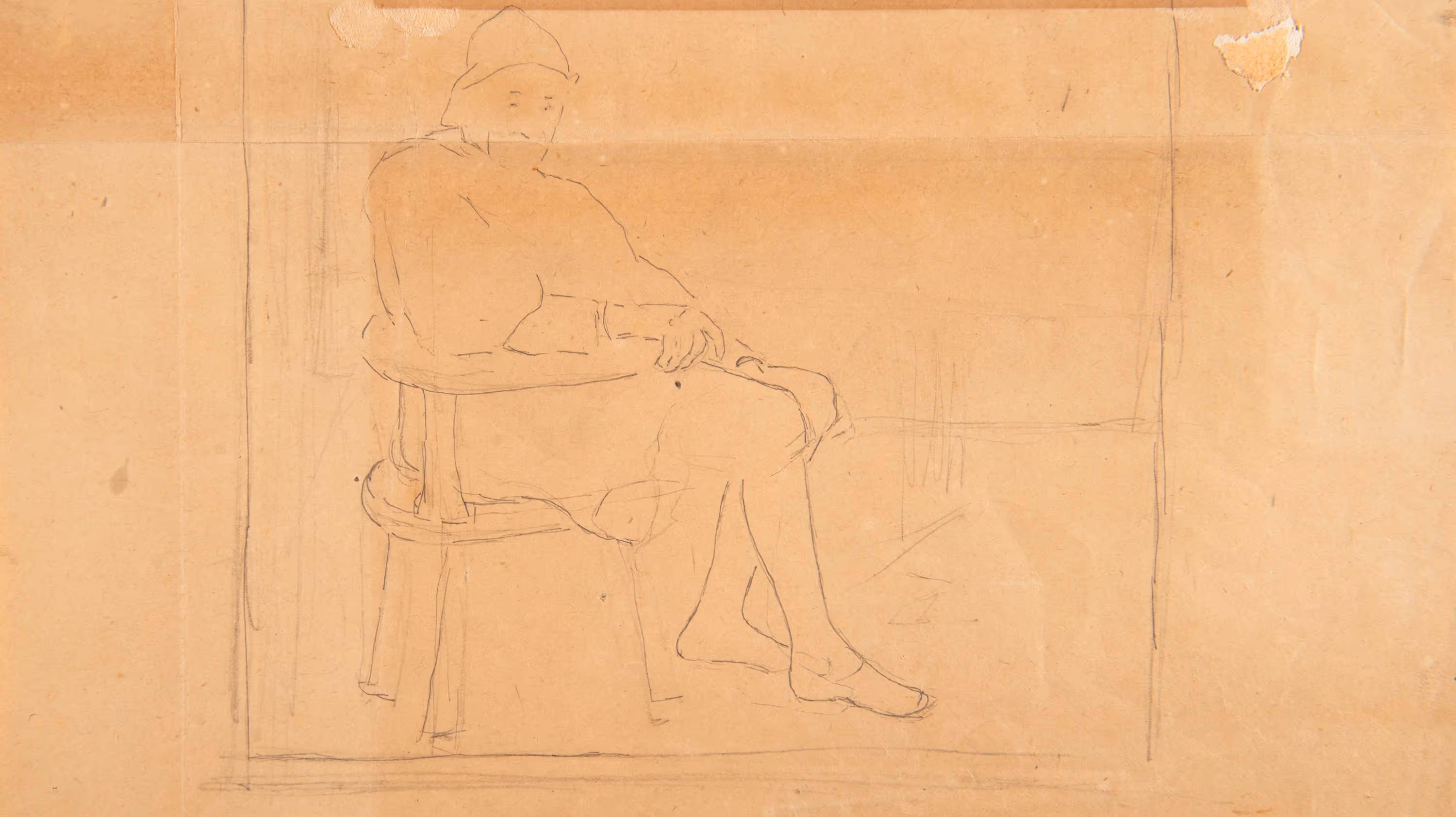 This is a study of a figure for A Breton Interior, a painting that shows a veteran Breton soldier sharpening his blade as his son, a military volunteer, looks over his shoulder. The focus of this study, however, is the veteran’s wife. She sits on the left-hand side of the painting with her young granddaughter, molding bullets over a charcoal flame. Hovenden appears to have been interested in the position of the seated woman, including the placement of her legs. Her position is different in the finished painting.