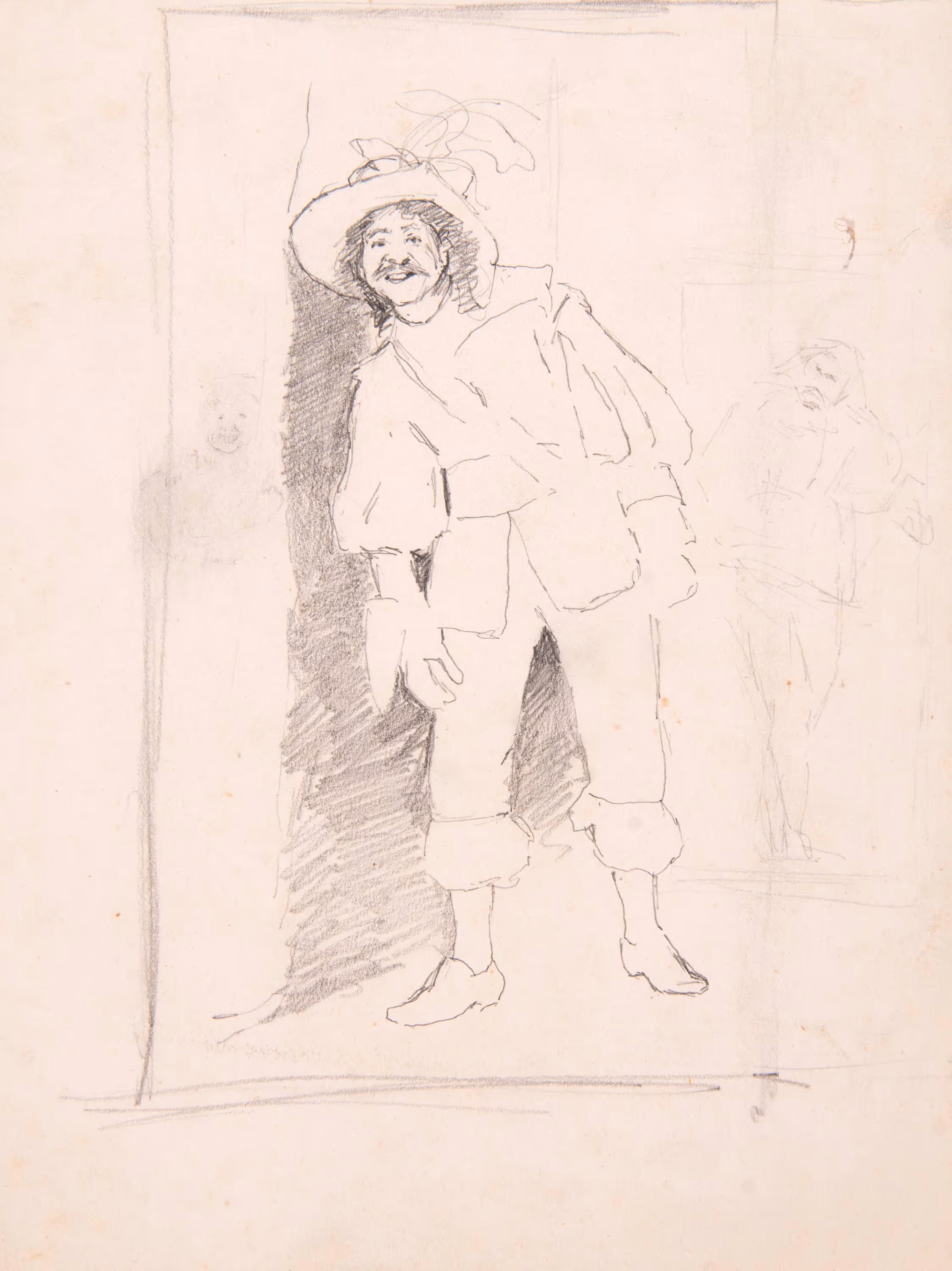 What distinguishes this drawing from Hovenden’s two others of the same subject in Woodmere’s collection is the dramatic addition of the figures on either side of the musketeer. The figure in the background on the right has the furrowed eyebrows of someone who is scowling. He appears to be emerging from a doorway. On the left side is a disembodied face with a wide grin.
