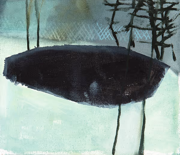 Zones of color create spatial ambiguities in Bush’s small but powerful wintry landscape. An oblong black polygon—perhaps a frozen pond—dominates the composition. Bristly black lines anchor the mass to the top and bottom of the canvas. The soft green foreground slopes gently from left to right, offset by a steely gray that could be an ominous sky or dense forest.
