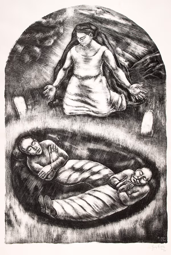 George Biddle’s lithograph depicts Sacco and Vanzetti lying in a shallow grave, wrapped in burial shrouds and posed in benediction. An imposing woman kneels over them, extending her arms and hands in grief. She mourns their false imprisonment and death, and the injustice of the US legal system. The stark contrast of black and white heightens the bleakness of the scene.