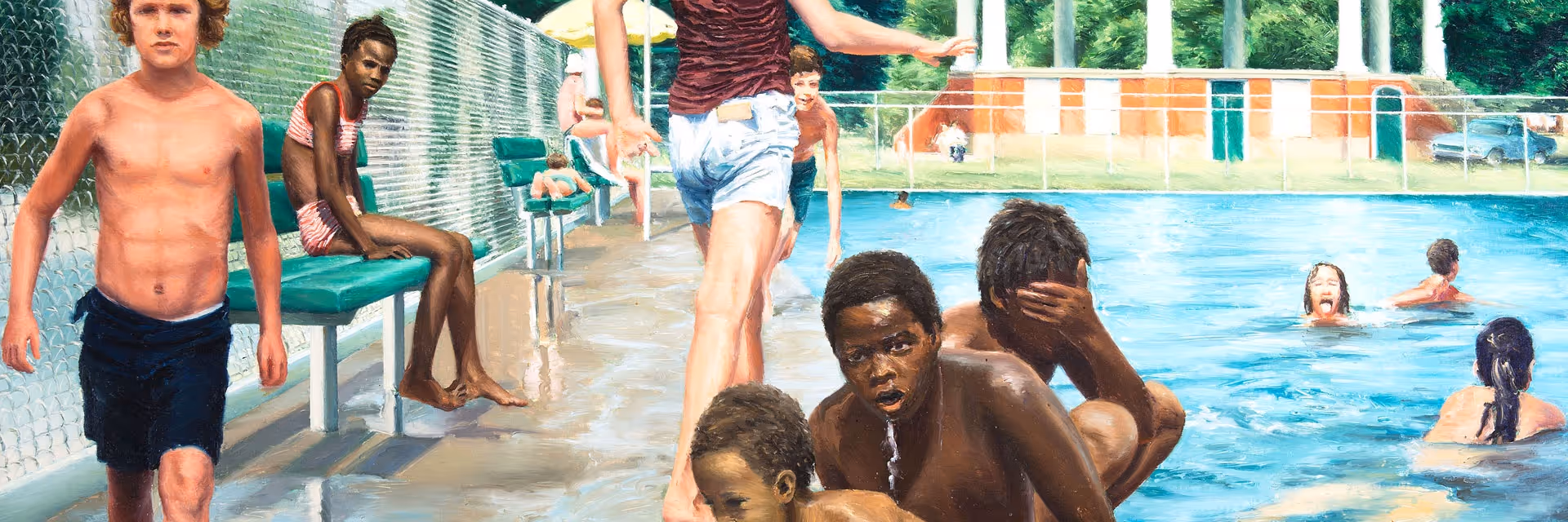 A leading realist painter of her day, Edith Neff (1943–1995) was praised for her dynamic compositions, her sophisticated use of color, and her ability to portray drama in everyday life. She explored questions of race, gender, and identity, probing the social and cultural fabric of Philadelphia. Working from photographs she took herself, Neff made self-portraits as well as pictures of her family, fellow artists and colleagues, friends, neighbors, and students. The city itself was central to her work: its public buildings, playgrounds, parks, pools, schools, and beaches were frequent settings.