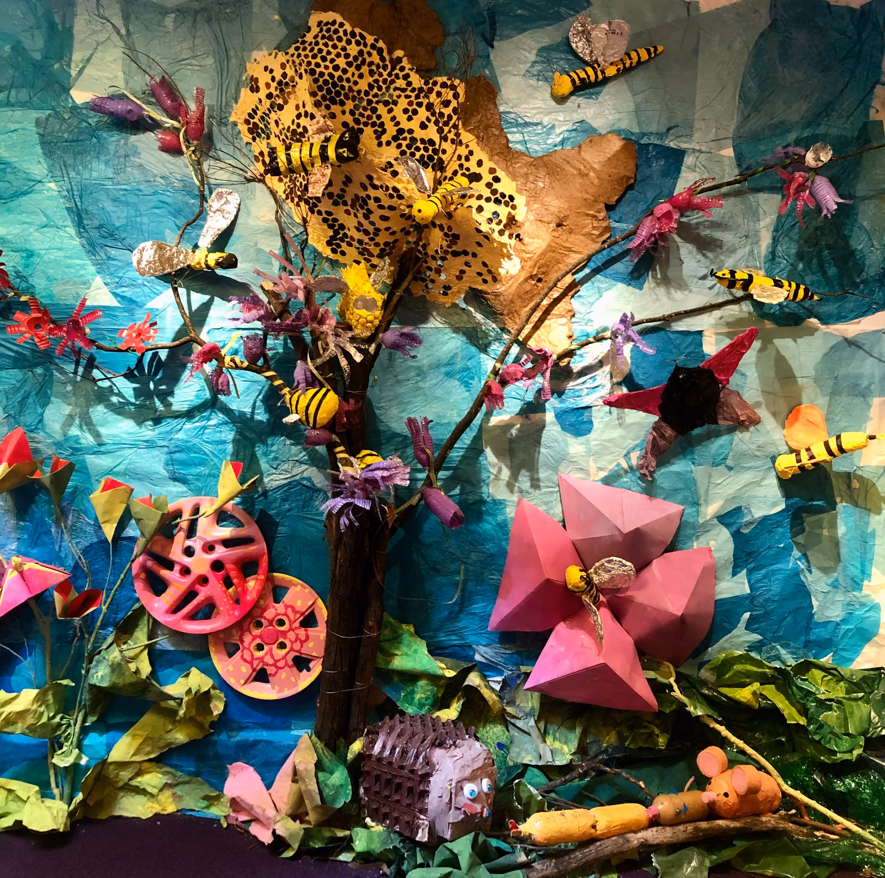 Pollinator Power! is an immersive installation that celebrates the miracle and interdependence of pollination, a system in which flowers and pollinators each provide what the other needs. The artworks on exhibit were created by a diverse group of artists, ages 6 to 26 years old, working together at Mindy Flexer Art School and Allens Lane Art Center, under the direction of Mindy Flexer and her apprentice Molly Hynes.